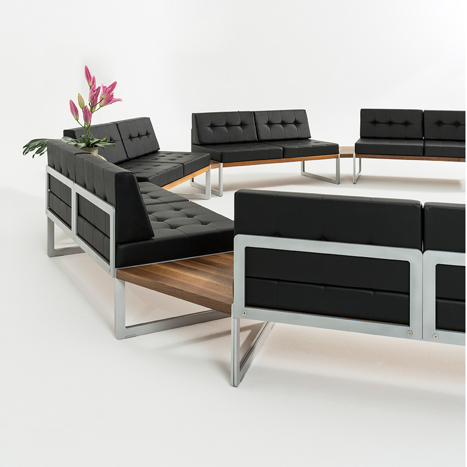 Unser Klassiker in schwarz besticht durch klares Design und edle Materialien: Vollholz aus geöltem Nussbaum, wasserstrahlgeschnittenes Aluminium, abgesteppte Polsterauflagen in B1 Ausführung.