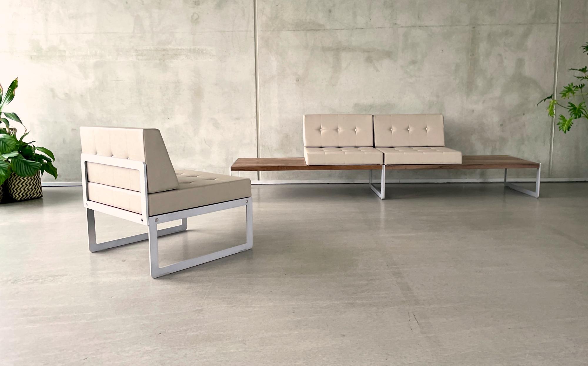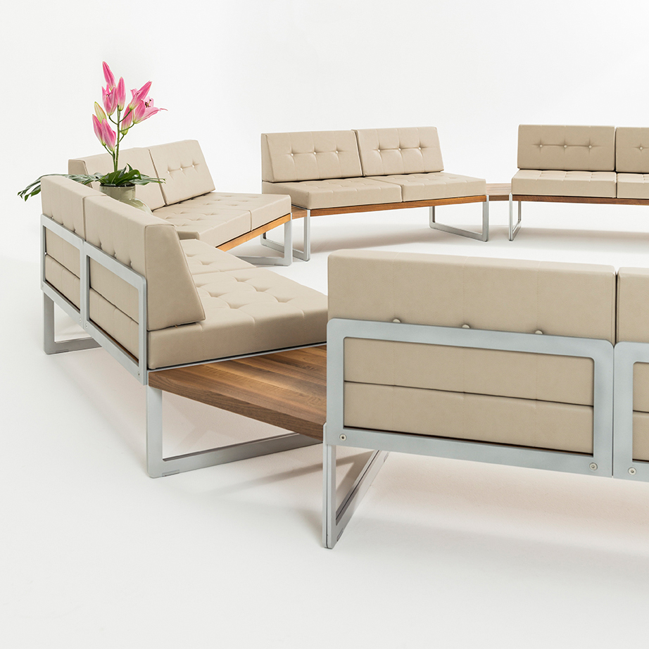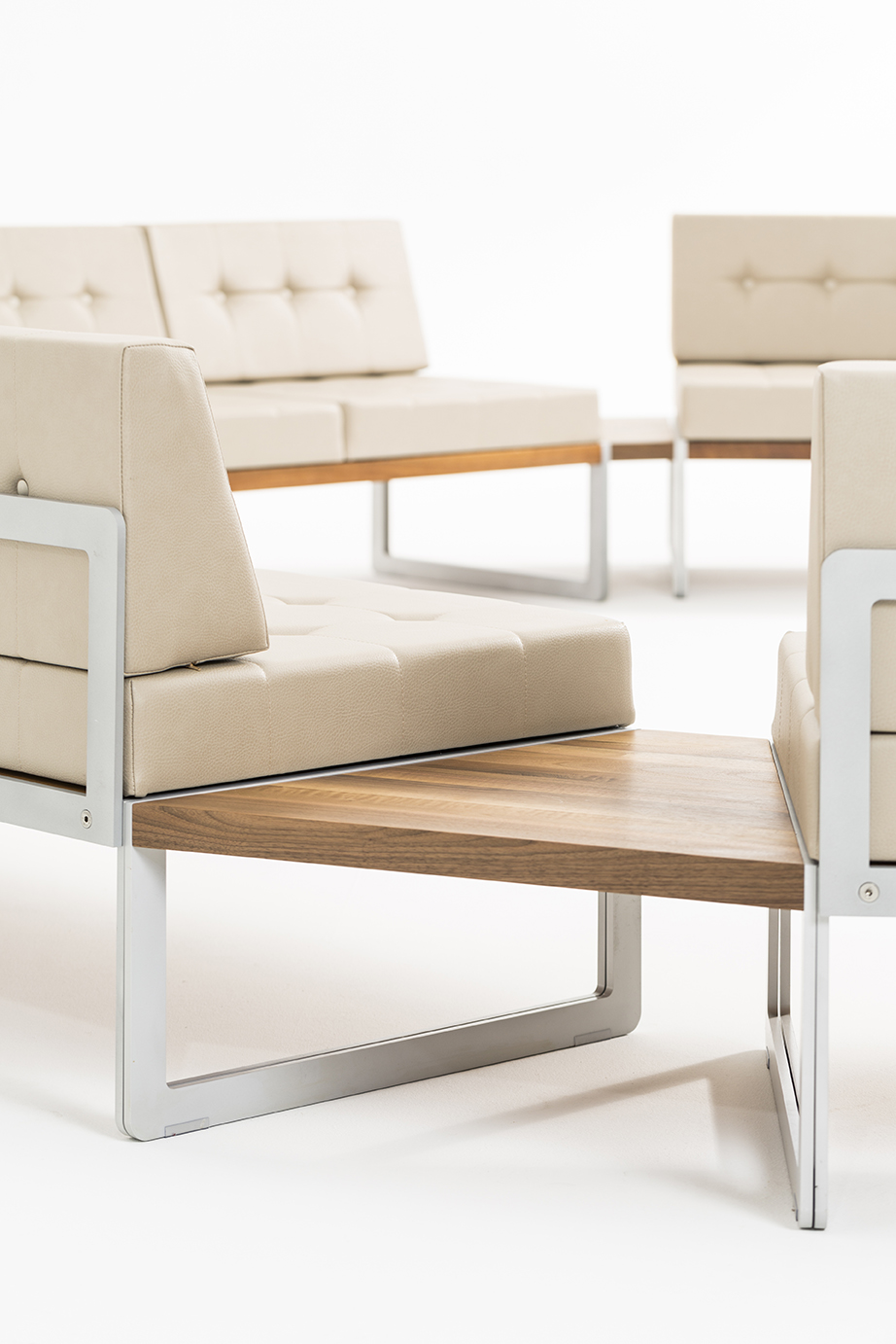 Unser Klassiker in beige besticht durch klares Design und edle Materialien: Vollholz aus geöltem Nussbaum, wasserstrahlgeschnittenes Aluminium, abgesteppte Polsterauflagen in B1 Ausführung.